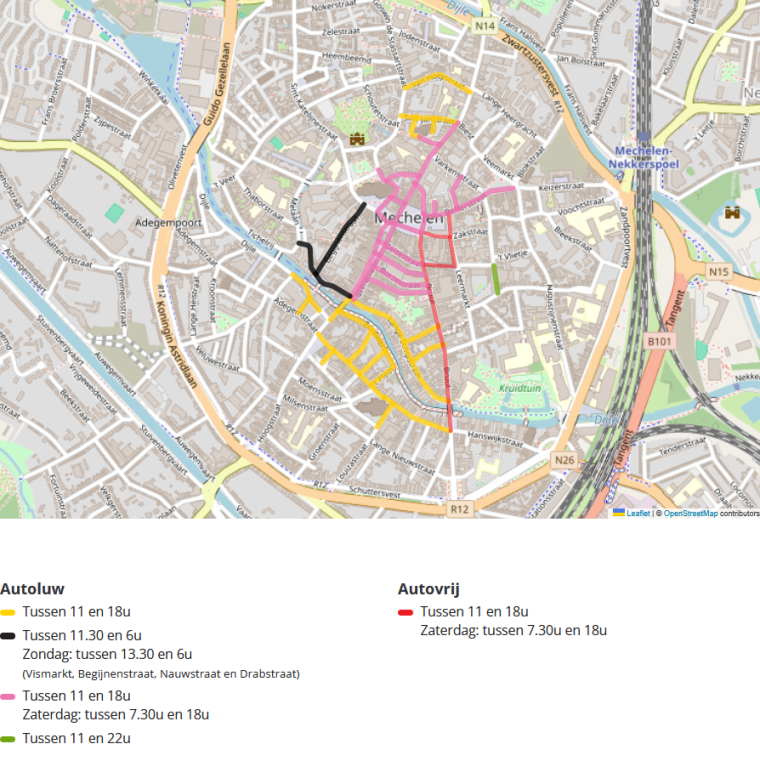 In hartje Mechelen zijn sommige straten tijdens bepaalde uren autoluw. Gemotoriseerd verkeer - zoals auto's, vrachtwagens en brommers - mag er dan niet rijden. Tenzij je een vergunning hebt. Voor de meeste autoluwe straten geldt dit tussen 11 en 18u. Er zijn wel een aantal uitzonderingen. Rijd je toch de autoluwe straat in, dan registreert een camera automatisch je nummerplaat en krijg je een boete. Je herkent de autoluwe zones aan de verkeersborden C3 en voorafgaande signalisatie.