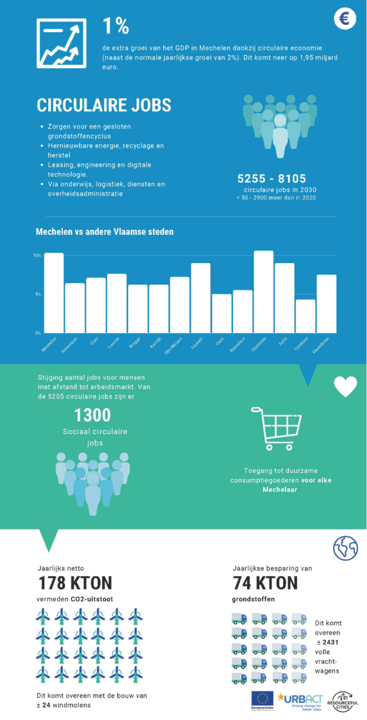 - economisch: ondernemingen zijn minder afhankelijk van grondstoffen die van ver moeten komen voor hun productieketen. Daarnaast is de circulaire economie goed voor 5205 nieuwe jobs in Mechelen tussen 2022 en 2030, waarvan 1300 jobs voor laaggeschoolden (potentieel voor sociale tewerkstelling).